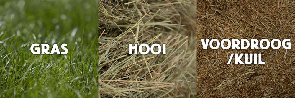 - Hooi: Gemaaid en gedroogd gras. Hooi is flink gedroogd en bevat ± 85–90% droge stof. Dit is stabiel in kwaliteit en goed houdbaar.